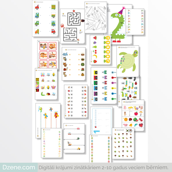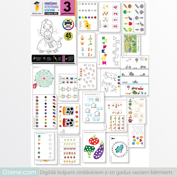 Šis digitālais krājums domāts 3 līdz 4 gadus veciem bērniem. Šajā vecumā noteikti dodiet bērnam griezt ar šķērēm! Ir ļoti svarīgi attīstīt un nostiprināt šo prasmi, tāpēc krājumā ir daudz griešanas uzdevumu. Ļaujiet bērnam griezt! Vēl krājumā atradīsit uzdevumus pirkstiņu un sīkās motorikas trenēšanai, šķirošanas, līmēšanas un krāsošanas uzdevumus, burtu un ciparu iepazīšanas, vienādu burtu savienošanas uzdevumus, kā arī uzdevumus ar raustītu līniju pārvilkšanu.