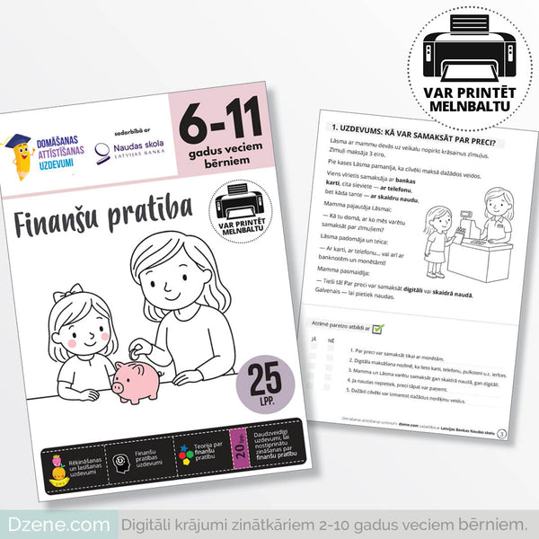 Man ir liels prieks paziņot, ka “Domāšanas attīstīšanas uzdevumi” sadarbībā ar Latvijas Banku ir izveidojuši bezmaksas uzdevumu krājumu 6–11 gadus veciem bērniem — “Finanšu pratība kopā ar Latvijas Bankas Naudas skolu”. Lejupielādējiet krājumu bez maksas un risiniet dažādus domāšanu attīstošus uzdevumus par finansēm!
